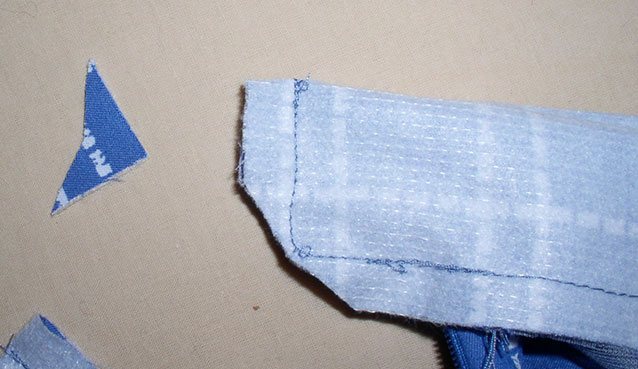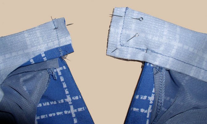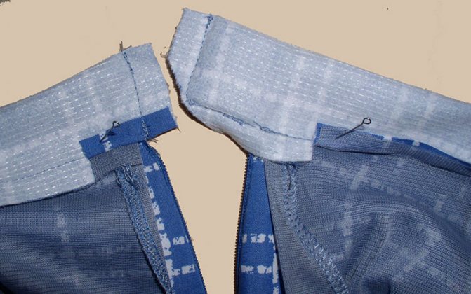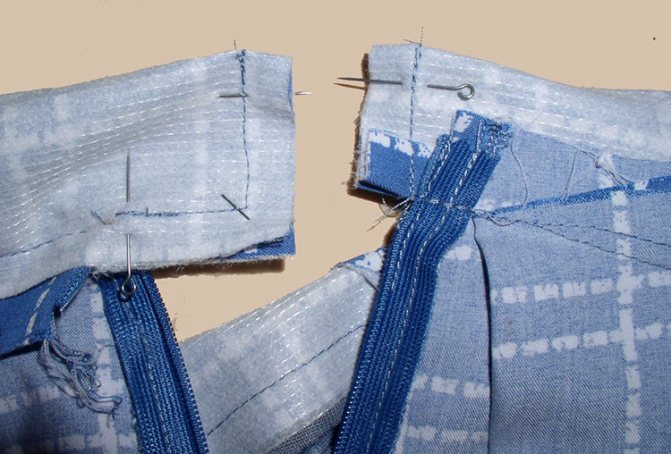 Затем крепим обработанный лоскут ткани к изделию, используя английские булавки. Обе половины подкладки должны полностью закрывать поверхность изделия, в том числе боковые швы. С помощью ножниц отрезаем излишки материала на месте расположения разрезов и молнии.