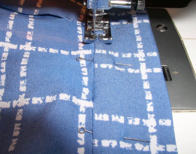 Прокладываю строчку точно в шов. Подойдя машинной строчкой к булавке, вытаскиваю булавку, затем прокладываю строчку дальше. Из-за булавок может деформироваться строчка и погнуться или обломаться игла.