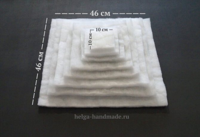 Довольно долго у меня лежали остатки синтепона, из которых я решила сделать наполнитель для декоративной подушки. Синтепон разрезаем на квадраты. Самый маленький квадрат 10х10 см, а самый большой зависит от того, какого размера вам нужна подушка. Каждый квадрат отличается от другого примерно на 5-6 см. Для подушки 43х43 см у меня получилось 8 квадратов от 46 см до 10 см (46, 40, 35, 30, 25, 20, 15, 10 см).