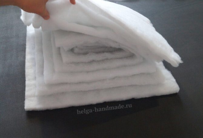 Кладём одну стопочку синтепона на другую маленькими квадратами друг на друга, как показано на экране.
