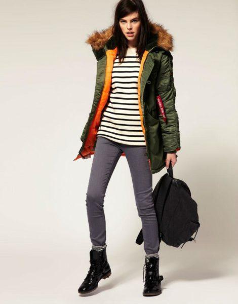 Несмотря на то, что куртки парки относятся более к спортивному стилю одежды, стилисты предлагают нам сочетать их с юбками и платьями, джинсами, ботинками на низком каблуке в мужском стиле, а также обувью на каблуке.