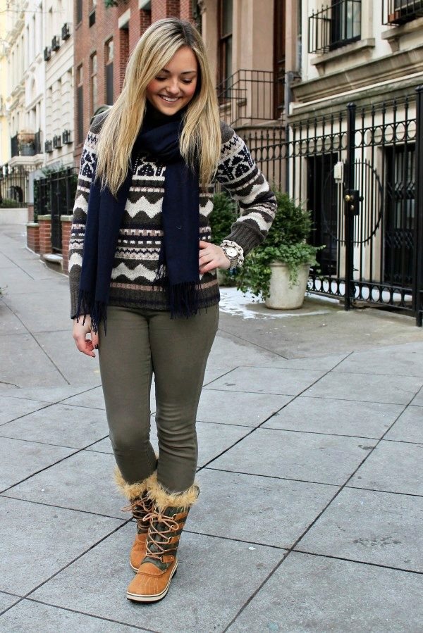 Зимой лучше всего выбирать сапожки трубы без каблуков или не значительной высоты, чтобы на льду чувствовать себя также убедительно, как на подиуме. При этом среди материалов нужно обратить внимание на естественную кожу, а также заменитель её. На обуви зачастую присутствует меховая подкладка. При выборе цвета стоит обратить особое внимание на монотонные принты.