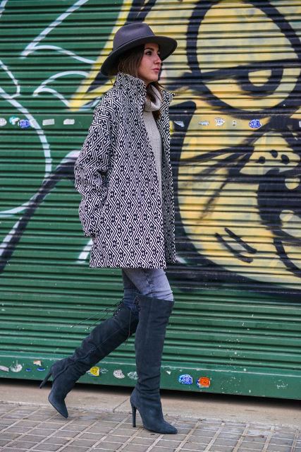 Зимние замшевые сапоги-чулки черного цвета, со шнуровкой сзади и на высоком каблуке в сочетании с узкими джинсами синего тона, свитером светло-серого оттенка, пальто черно-белой расцветки с принтом, прямого кроя, средней длины и широкополой черной шляпой.