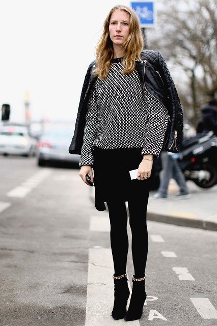 Короткие замшевые сапоги черного цвета, с острым носком, цепочками и на высоком каблуке в сочетании с асимметричной юбкой-мини черного тона, кофтой черно-белой расцветки свободного фасона и короткой кожаной курткой черного цвета с фактурным рисунком.