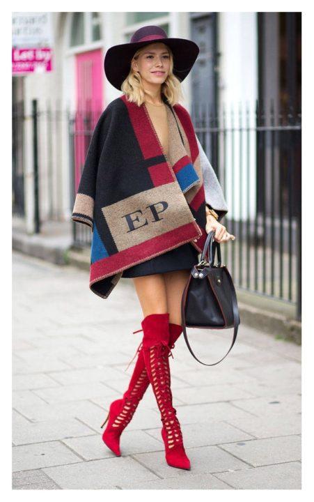 Красный – цвет этого сезона. Его темные и светлые оттенки должны присутствовать в любом гардеробе. Красные, бордовые, синие сапоги сочетают с одеждой в спокойной приглушенной гамме. Модели золотого цвета на плоской подошве подходят к вечерним нарядам, делая образ смелым. Обувь с принтами, имитирующими окраску животных – леопарда, тигра, зебры, подойдут для создания необычного экстравагантного образа. Если обувь имеет привлекающий внимание цвет, то в образе должен присутствовать аналогичный оттенок сумки, шарфа или других аксессуаров.