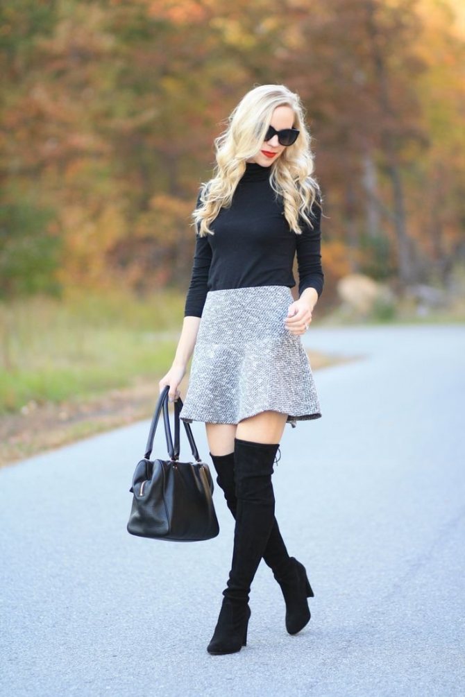 - Короткая юбка также хорошо смотрится с замшевыми сапогами.