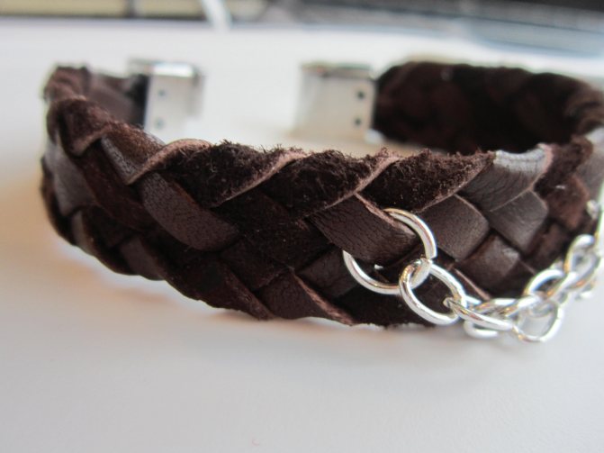 Простой, но эффектный, плетеный браслет получается из полоски кожи.