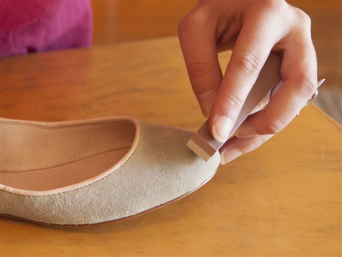 - Для ухода за обувью необходимо использовать мягкие щетки с натуральным жестким ворсом. Для очищения от грязи можно применять мягкий наждак (нулевку), ластик. Наждачная бумага поможет и в том случае, если ворс залоснился.