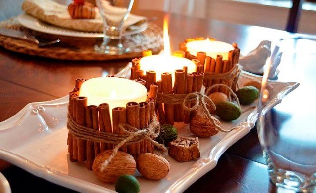 В центре такого ансамбля можно поместить высокую свечу красного или белого цвета или декоративную свечу в бокале. В этом году дополнить их можно и экзотическими фруктами, например, апельсинами, украшенными почками гвоздики.