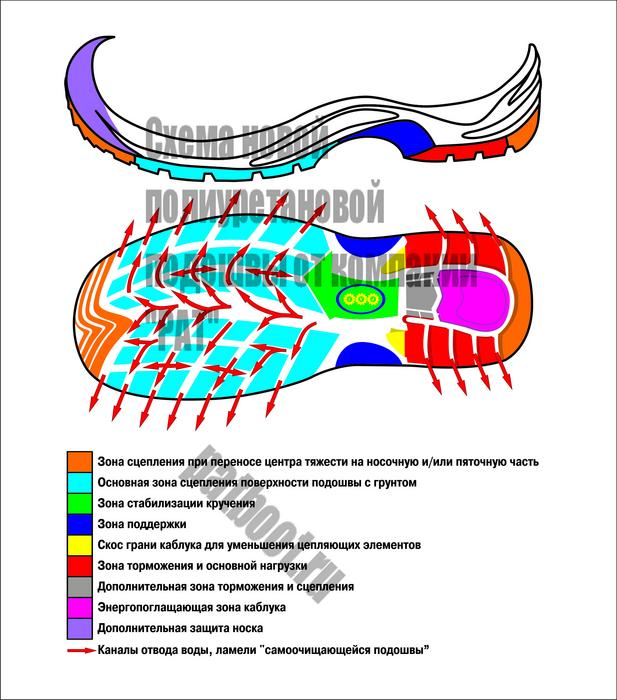 - между зонами проведены специальные каналы — ламели, по которым отводится вода и грязь при ходьбе по мокрому грунту, позволяя «самоочищаться» подошве;