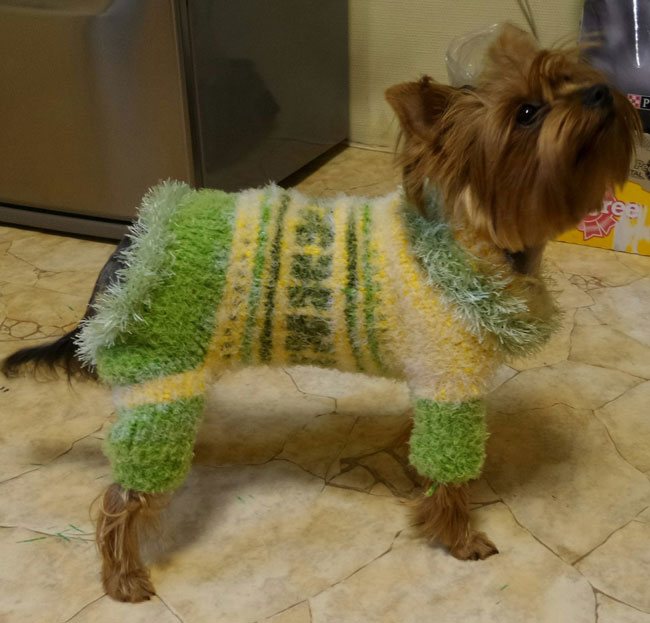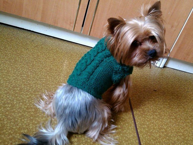 Больше того, чтобы уберечь от холода щенка йоркширского терьера хватит даже теплого носка. Важно позаботиться о том, чтобы шерсть имела гипоаллергенные свойства. На схеме следует добавить к длине спины около 5 см.