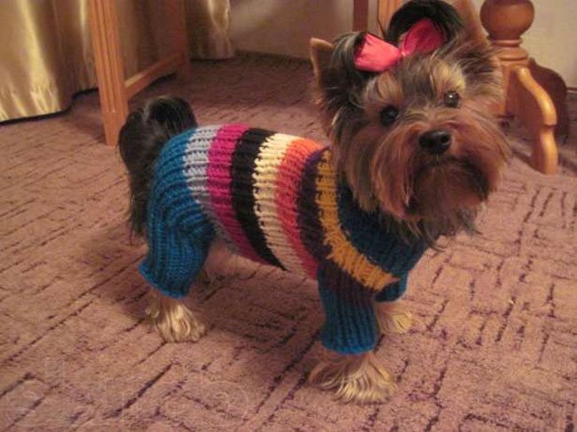 Для вязания свитера собаке необходимо знать объем шеи, груди, талии йорка, расстояния от холки до передней лапы и длину по спине от правой ноги до левой. Вначале нужно изготовить верхнюю часть по стандартной выкройке, затем грудь. Далее – рукава, и в конце сделать воротник. На фото изображены популярные модели для йорка.