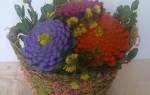 Для создания красивого осеннего букета понадобится старая корзинка в которую можно поместить живые цветы и травы. Чтобы цветы не вяли в магазине для флористики продают специальный материал напоминающий губчатый пластилин в который втыкаются цветы. Таким образом букет долгое время будет сохранять свою свежесть за счёт влаги, находящейся в губке. Можно создать прекрасную композицию из засушенных цветов и дополнить её хвойными веточками с шишками или травами. Сухие букеты при необходимости можно покрасить в нужный цвет из баллончика. Для более долговечной композиции подходит сушеный гербарий.