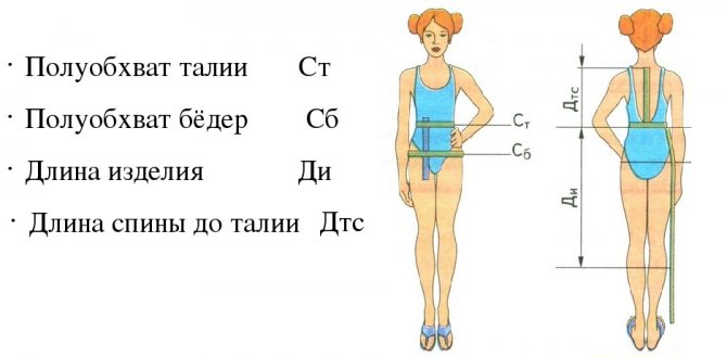 Следующий этап – построение скошенной линии талии. От точки Т проводится плавная линия для передней части со спуском в 1,5 см, для задней – в 1 см. Затем оформляется скос от линии талии до бедер. Для этого от половинного значения обхвата бедра плюс один сантиметр отнимается сумма половинного обхвата талии и прибавки в 1 см. Затем от полученного результата вычитается 5 см (передняя плюс задняя вытачки). Итог делится на два. Полученное значение откладывается от точки Т в обе стороны и обозначается Т1, Т2.