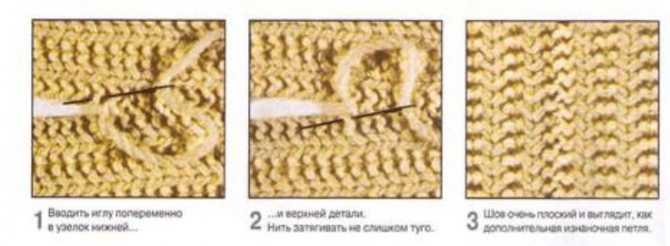 Есть и другие виды трикотажных швов, которые используются в вязании спицами для выполнения операций, где требуется соединить края разных деталей. Рассмотрим еще две их разновидности.