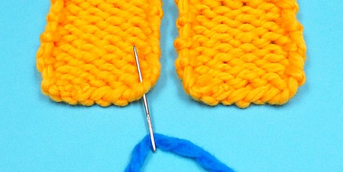 Проденьте пряжу в иглу поверните детали лицевой стороной к вам и расположите края напротив друг друга.