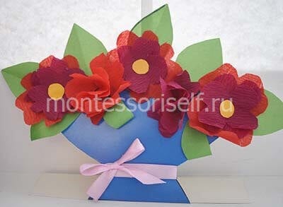 Роскошную аппликацию маме на день рождения можно сделать из гофрированной бумаги и картона.