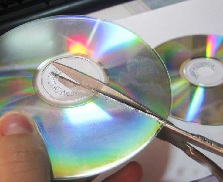Резать диски можно обычными ножницами. Главное не повредить голографическую плёнку, благодаря которой обеспечивается мерцание. Использовать лучше менее поцарапанные диски, чтобы поделки выглядели аккуратно. Перед работой нанесите клей на сторону диска с рисунком, чтобы избежать повреждений.