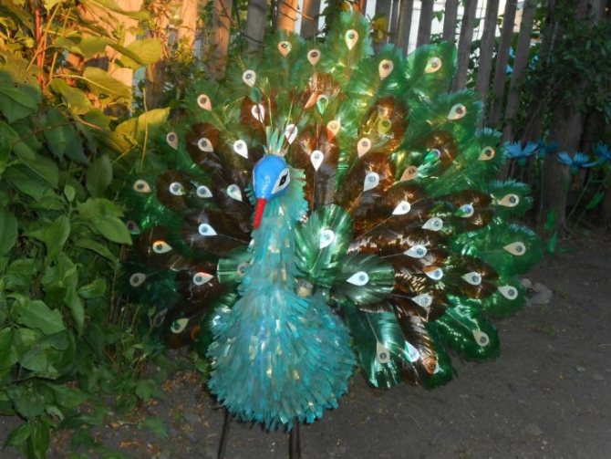 Хотим предложить вам рассмотреть такой интересный вариант поделки в виде птицы, сделанной из пластиковых бутылок и некоторых других материалов. Эта птица будет декоративным павлином для вашего сада.
