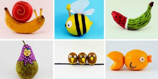 - Фигурки из фруктов, напоминающие животных, птиц, насекомых, морских обитателей, людей;