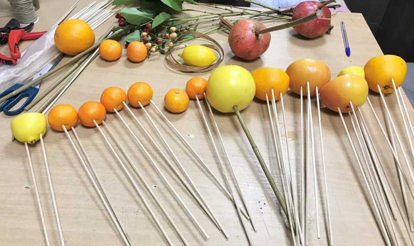Возьмите деревянные шампуры длиной от 30 см. Наколите на них гранаты, грейпфруты, хурму, киви, яблоки, лимоны — целиком или половинками. Скомпонуйте букет, шампуры скрепите скотчем или плотными нитями ближе к концам. Оберните в гофрированную/крафтовую бумагу или декоративный целлофан. Чтобы букет был более зеленым, добавьте мяту, мелиссу.