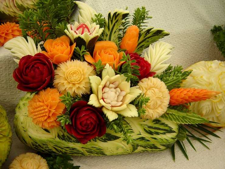 Эффектные образы получаются при применении более сложных приемов – гравировки на кожуре, художественной резки.