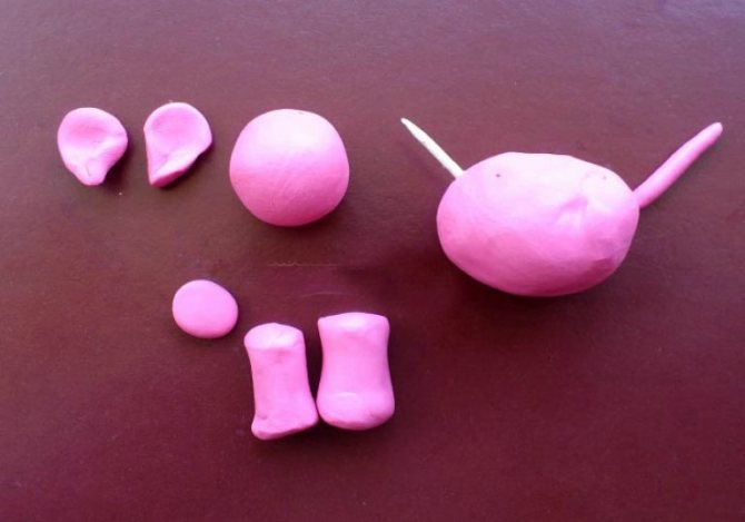 5. Из черного пластилина делаем глазки и копытца. Из розового пластилина делаем пятачок. Если нет розового пластилина, можно смешать красный и белый пластилин до нужного цвета. Вместо пластилина можно использовать цветную бумагу.