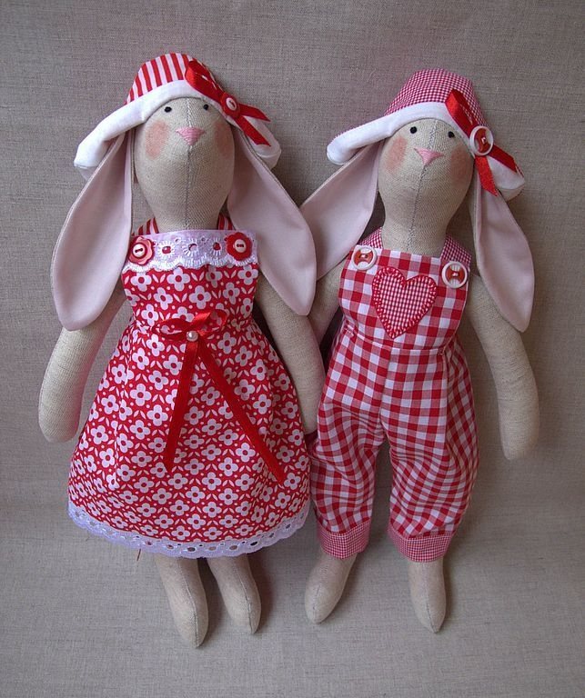 В принципе кролик и заяц сами по себе игрушки не сложные, и одежда у них тоже простая, деревенская, фермерская, пастельных или неярких тонов из хлопковых или льняных тканей.