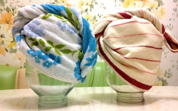 Примерно такую процедуру большинство женщин проделывают с полотенцем после мыться головы. Просто махровые полотенца выглядят объемно и менее изящно.