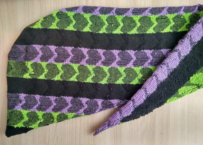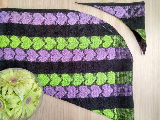 На припуски для швов оставила по 1,5 см. Может для кого-то не сложно сшить тюрбан для головы и из махровой ткани. Но для меня из полотенца сшить чалму для сушки волос менее хлопотно, так как кайма у полотенца уже обработана и меньше времени займет весь процесс шитья. Да и старые махровые полотенца, которые не жалко на то, чтобы сшить чалму для сушки волос, всегда найдутся у любой хозяйки.