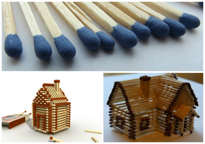 Аналогично клеят большой домик. Но для формирования длинных стен придется клеить не только углы, но и короткие стыки. Если при выкладывании следующего ряда на месте соединения спичечных концов будет располагаться длинный элемент – конструкция получится прочной.
