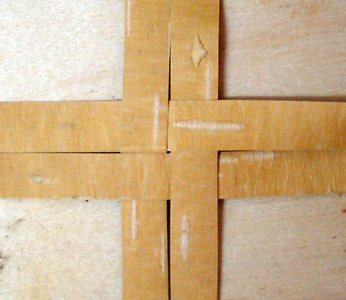 1) наложите одну лычку на другую под прямым углом друг к другу лицевой стороной вниз;