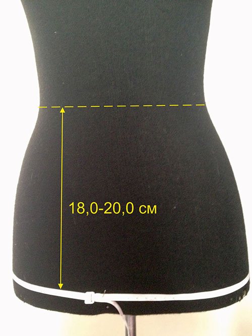 - положение линии бедер для построения юбки: 18,0 — 20,0 см (это измерение зависит от типа фигуры, при значительно нестандартной фигуре это измерение необходимо снять непосредственно с фигуры).
