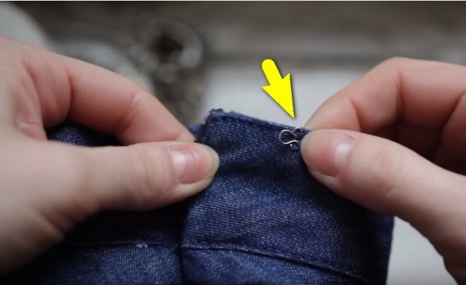 Теперь дело за малым: с противоположный стороны (слева от ширинки) пришить сам крючок. Только будьте внимательны, чтобы и крючок и петелька были чётко на одной линии. Иначе волшебства не получится.