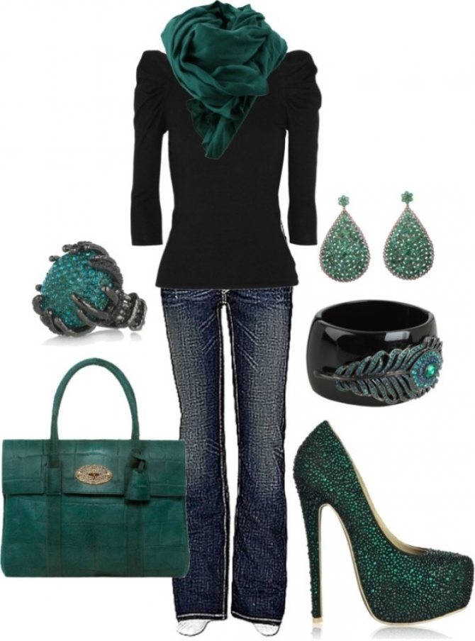 Выигрышное сочетание темного изумрудного цвета с синими джинсами и черным верхом