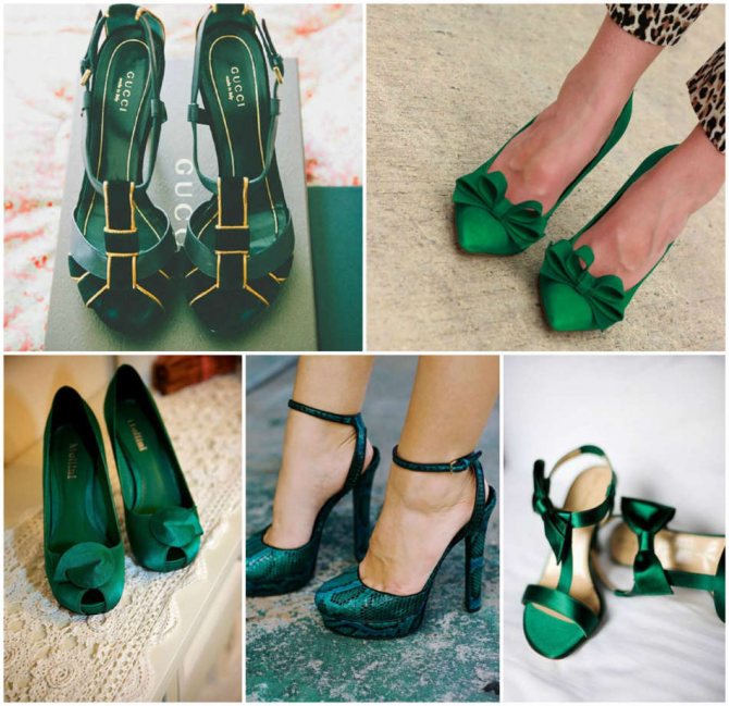 Туфли изумрудного цвета — так же, как и платье, актуальный и популярный тренд. Такую обувь можно успешно сочетать с любой одеждой в любых тонах, ведь главная задача туфлей — «обратить на себя внимание».
