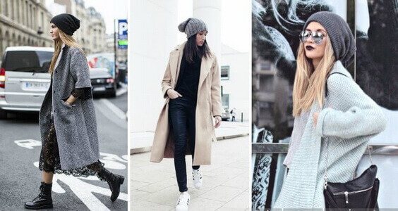 Свитер спокойного оттенка и объёмная шапка бини того же цвета сочетается с чёрными спортивными штанами, длинным серым или бежевым пальто, кедами и маленькой сумкой через плечо. Спортивные штаны и свитер можно заменить на популярный сейчас трикотажный костюм из штанишек и джемпера одного цвета.