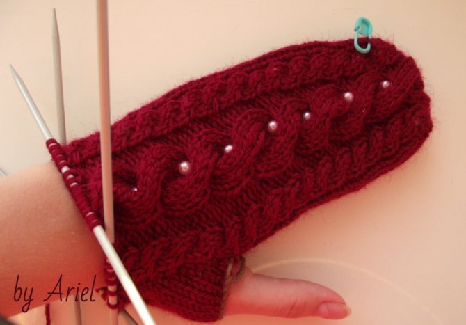 - Так продолжается 6 см, потом отмечается 9-я п. и в следующем ряду с двух сторон отметки прибавляется по 1 п. (с протяжки между петлями провязывается скрещенная лицевая). Так повторяется и в следующем ряду – это начало большого пальца.