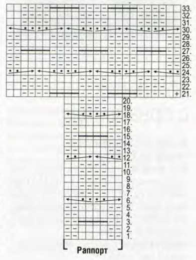 - Через 20 круговых рядов, с 21-го, меняются спицы на № 4 и дальше вместо резинки идет лицевая гладь (только лицевые — лиц. п.), узор продолжается по схеме. Получается следующая последовательность: 22 лиц. п., 23 + 1 рельефный узор. В конце строчки получится 46.