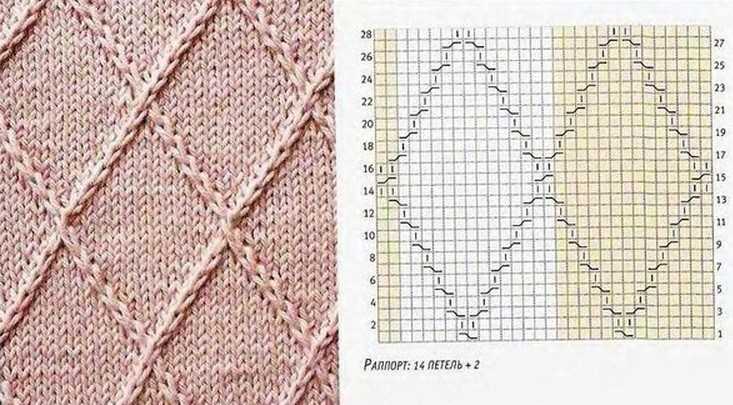 Шикарный узор, которые напоминают оригинальную плетенку. Такими ромбами можно вязать свитера, джемпера, кардиганы и многое другое. Полотно имеет изнаночную и лицевую сторону, вяжется по кругу в том числе.