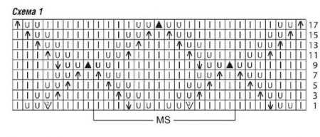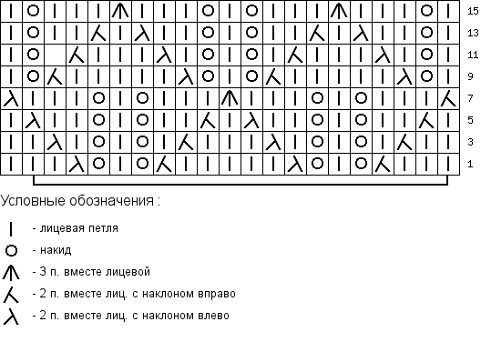 Кратность набора в данном случае должна быть 10, плюс 2 кромочные. Условные обозначения вязания, как на предыдущей схеме.