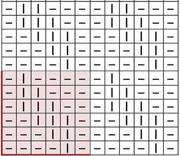 В такой схеме вертикальные полоски это изнаночные, а горизонтальные — лицевые. Количество вертикальных и горизонтальных петель в такой схеме можно изменять по желанию, тогда будет меняться и вид рисунка: либо растягиваться, либо сужаться. Дальше чередуются вязки, образуя элементы трех видов.