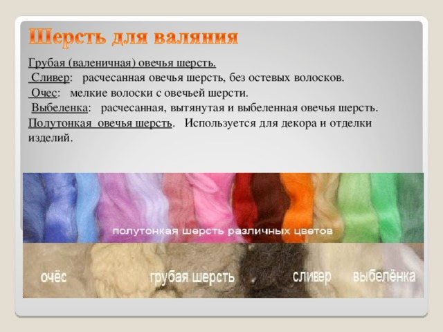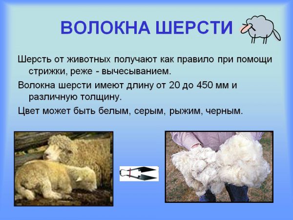 - Характеристики шерсти зависят от основного сырья, процесса добычи, вида животных, используемых в качестве «поставщиков» этого материала.