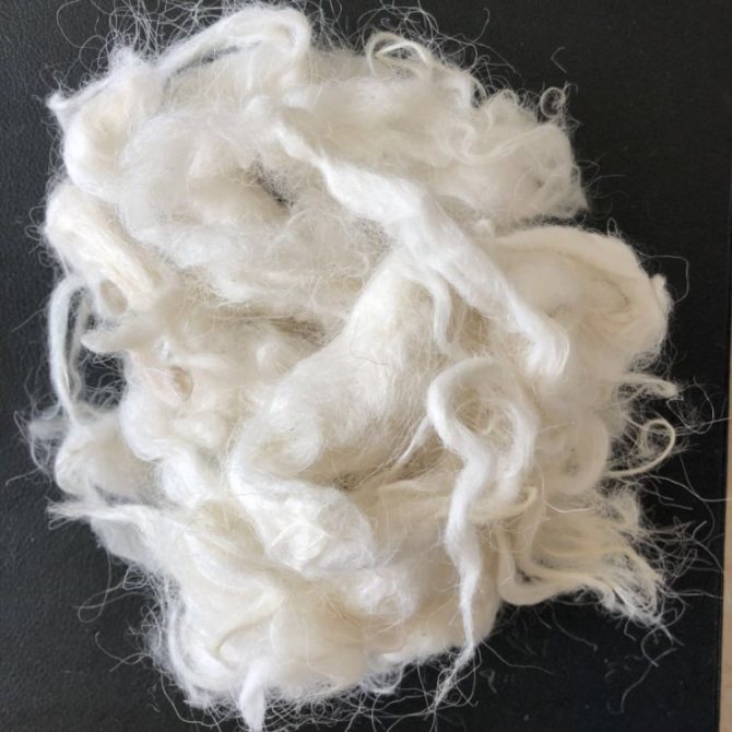 - Пух получают путем вычесывания шерсти животных. Эти тонкие извилистые волокна редко используются без «укрепляющей» основы.
