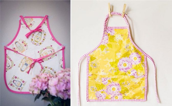 По этому базовому способу вы сможете сшить и фартук для девочки, но, конечно, в этом случае ткани нужно выбрать соответствующей расцветки, выкройку можно сделать посложнее, например, с круглой юбочкой и фигурным лифом, ну и конечно добавить рюши, кружева или аппликации. Вот так могут выглядеть девчачьи фартучки, сшитые по описанному нами способу.