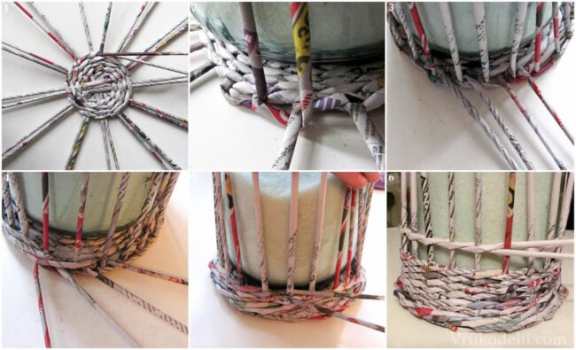 - После того как дно сплетено, концы поднимите вверх и начните плести стенки. Как будет достигнута нужная высота стенки, бумажные прутки нужно будет загнуть для приобретения эстетичного вида изделия.