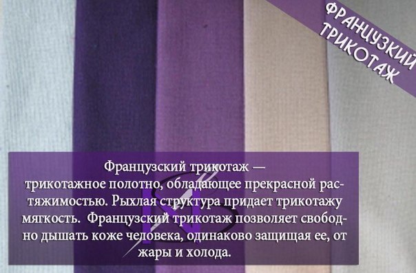 Французский трикотаж различается по степени плотности. Самая плотная материя подходит для пошива теплых зимних изделий, ткань средней плотности используется при создании демисезонных элементов гардероба, а из легкой материи можно шить красивые и удобные летние вещи.