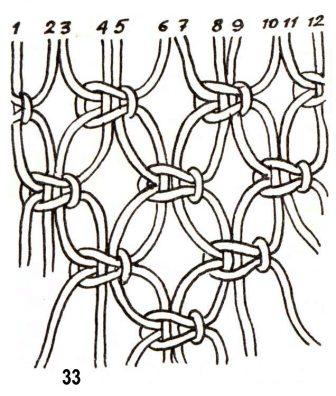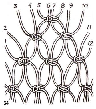 Это плетение выполняется от одного узла и в каждом последующем ряду провязывается по одному дополнительному узлу, т. е. плетется от одного узла к нескольким (рис.34). |