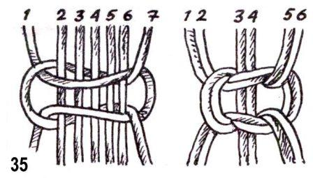 Этот узел выполняется как обычный, только увеличивается число нитей основы, а иногда добавляются рабочие нити, в зависимости от задуманного узора (рис. 35). |