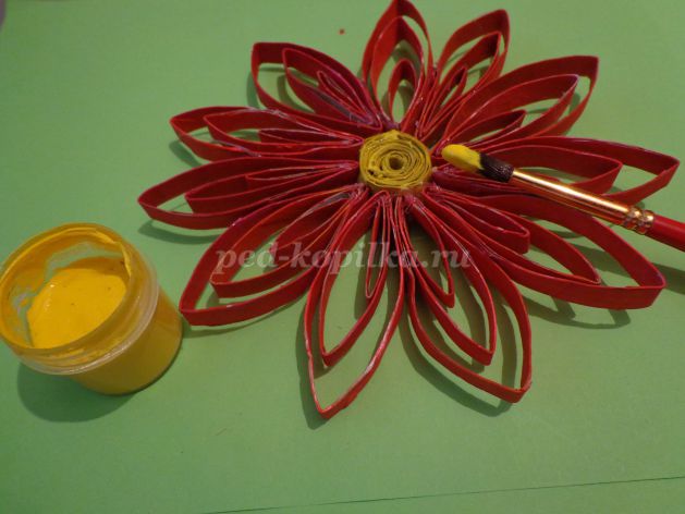 Получился вот такой цветок. Но некоторые погрешности в покраске цветка немного заметны, поэтому берём жёлтую и красную акриловые краски и прокрашиваем торцы.